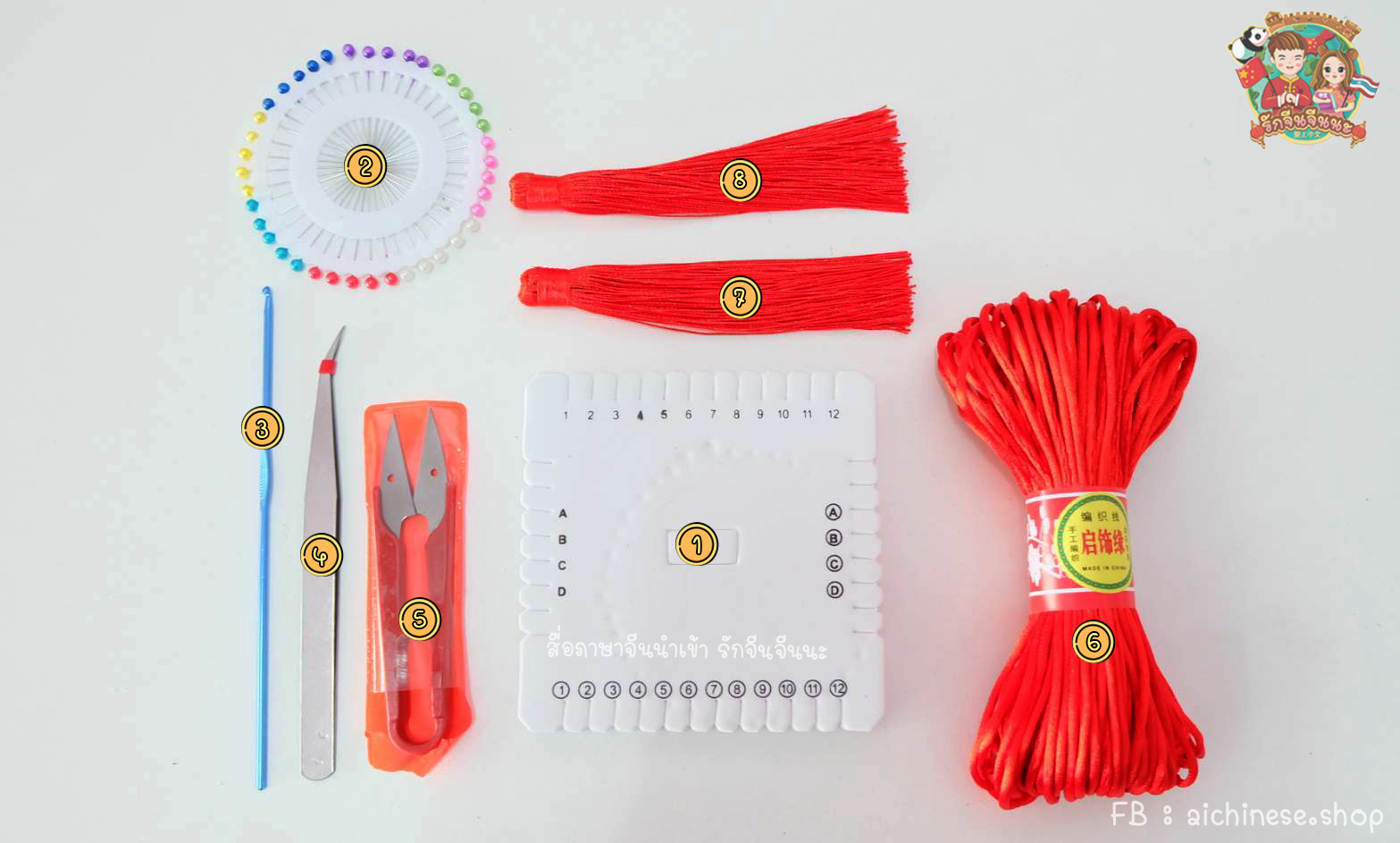– พู่เชือกถักจีนสีแดง 20 เมตร 1 ม้วน (หมายเลข 6 ในรูป)